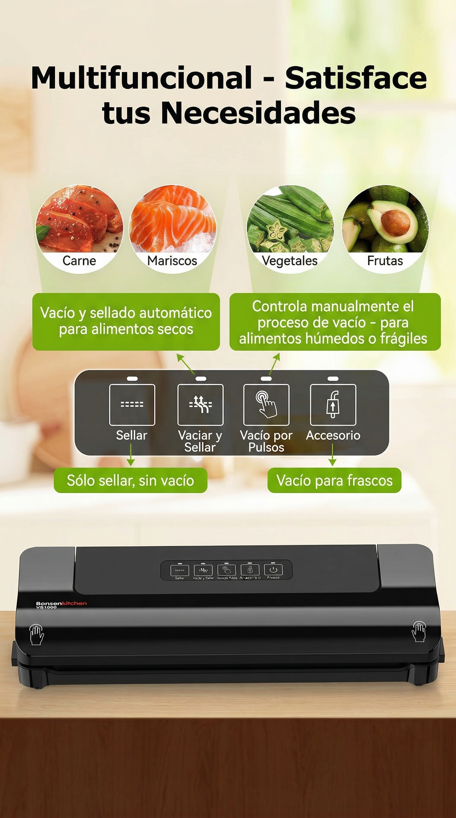 La selladora al vacío portátil que conserva tus alimentos hasta 8 veces más. Un solo botón. Cero desperdicio.